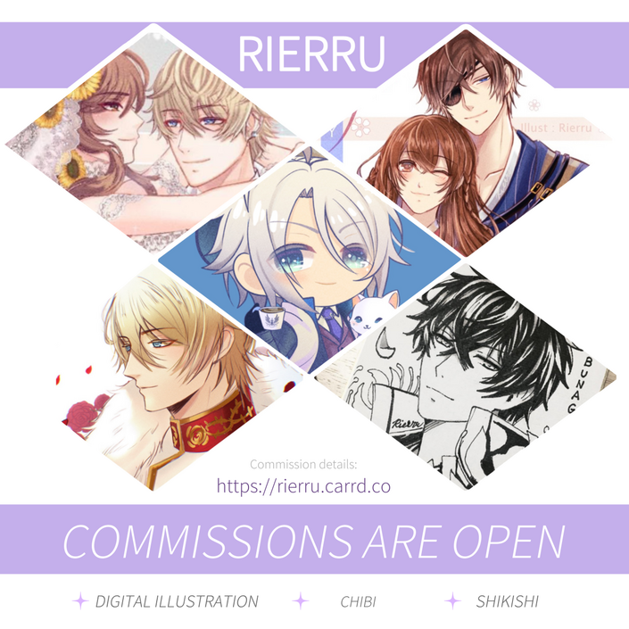 - You can contact me in my social media pages (@Rierru) for updates or inquiries.__COPYRIGHT AND USAGE__- All commissioned artwork is for PERSONAL USE only. Any commercial usage such as redistribution of my artwork for use in printed merchandise or as promotion of goods, services or social media pages is prohibited **- I retain rights to the artwork . I have the right to promote myself and to display all commissioned works on any website , gallery or portfolio .__COMMERCIAL USE__- For commercial use of the commissioned artwork ,commercial fees will be added.