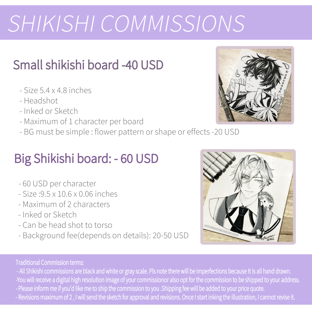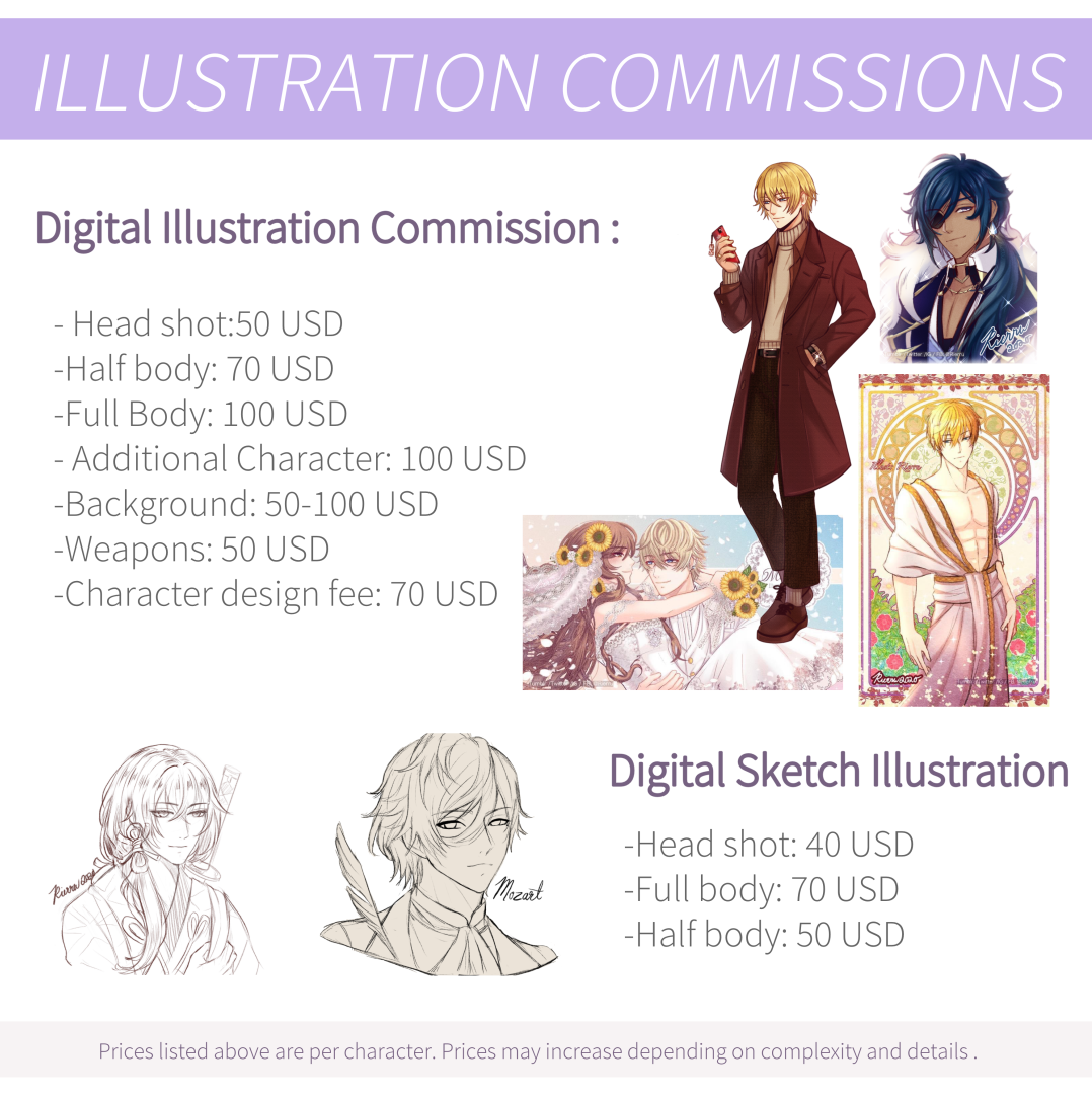 - Additional Revisions : If you exceed the maximum of 2 revisions. An additional charge per revision will occur.Reference Images :- Visual References are REQUIRED for the commission. Please provide references for important parts (details) of your characters.Work in progress :- You may ask me to provide a screenshot of my progress of your commission work once I start it .Final artwork:Once I’ve completed the artwork , the client will receive a high resolution image+ watermarked version via email .- For digital commissions: I will only provide a high resolution image of the commission work. I will not provide the raw (psd) file .- For Traditional commissions: I will provide a high resolution scanned image of the commission and ship the physical commission once the shipping fee has been paid.__CONTACT AND COMMUNICATION __Email